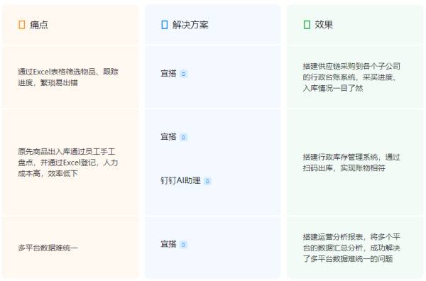 传统行政综合台账系统在企业规模扩张和业务复杂化的背景下,逐渐暴露采购、行政与财务三账割裂的核心痛点:数据孤立导致账目差异、手工流程嵌套致使审批周期冗长(非标采购分类加剧效率瓶颈)、供应商信息依赖人工更新诱发决策误差、合同与订单未联动引发物资验收断层,以及资产盘点依赖纸质记录的耗时耗力问题。为解决三账分离困境,团队依托宜搭平台构建全链路一体化系统: