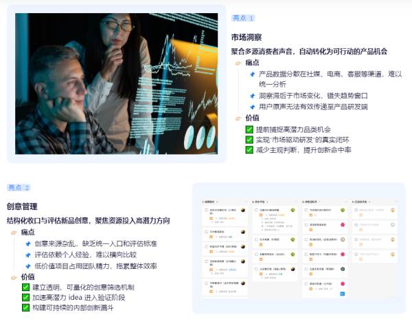 创意生成与产品验证——通过市场洞察提炼机会,结构化管理创意,并以轻量流程支撑快速打样、测试与试销;