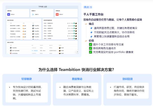 Teambition 快消解决方案以“敏捷创新”与“精准上市”双引擎驱动,构建从消费者洞察到商业落地的完整闭环。