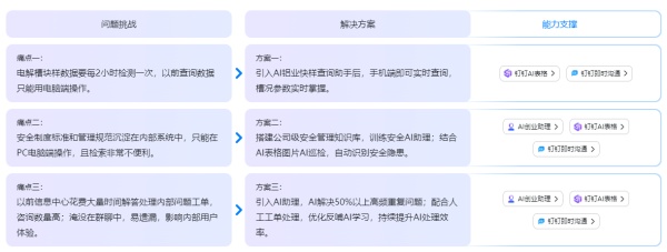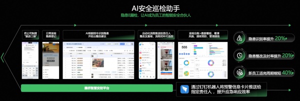 现在结合AI表格的功能,把日常巡检的巡检记录用AI表格替代了,充分利用了AI识图功能,把现场收集到的隐患照片拍到AI表格之后,自动识别其中的隐患。对于一些常见安全隐患的识别率可以达到80%以上,甚至要超过很多没有经验的员工。员工原来要拍照片,同时要自己生成隐患记录,现在通过AI表格提供了很大的方便,让工作效率和识别准确性大幅提升。 同时,AI表格的自动化和跟踪能力也非常强,这些隐患形成之后,会自动分发给相应的处理人,每个处理人在处理完成之后,需要在AI表格里面去做问题的闭环。整个隐患闭环都可以在一张AI表格里边实现全员覆盖。而且这些记录沉下来之后,又会返回到安全助理里面作为素材不断得到喂养,持续提升AI安全助理查询的能力。
