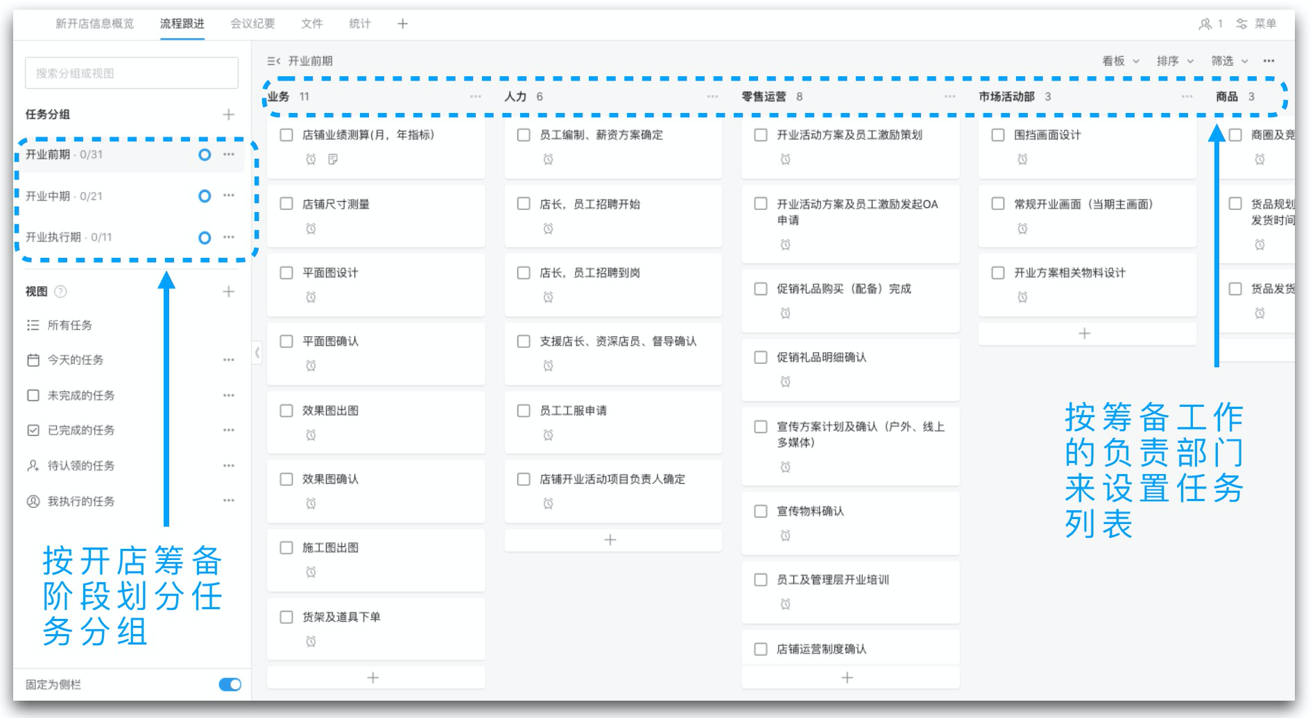 通过对开店筹备的⼯作分类,按阶段划分「任务分组」,并以任务列表的⽅式在「看板视图」中呈现,将开店筹备相关⼏⼗件任务的分⼯、计划和责任⼈统⼀进⾏管理。这样有助于⻔店负责⼈统筹安排繁杂的事宜,明确开店事宜的分⼯和计划,避免遗漏,并且任务进展和成果可以非常清晰、直观地展现,让管理更加便捷省时。