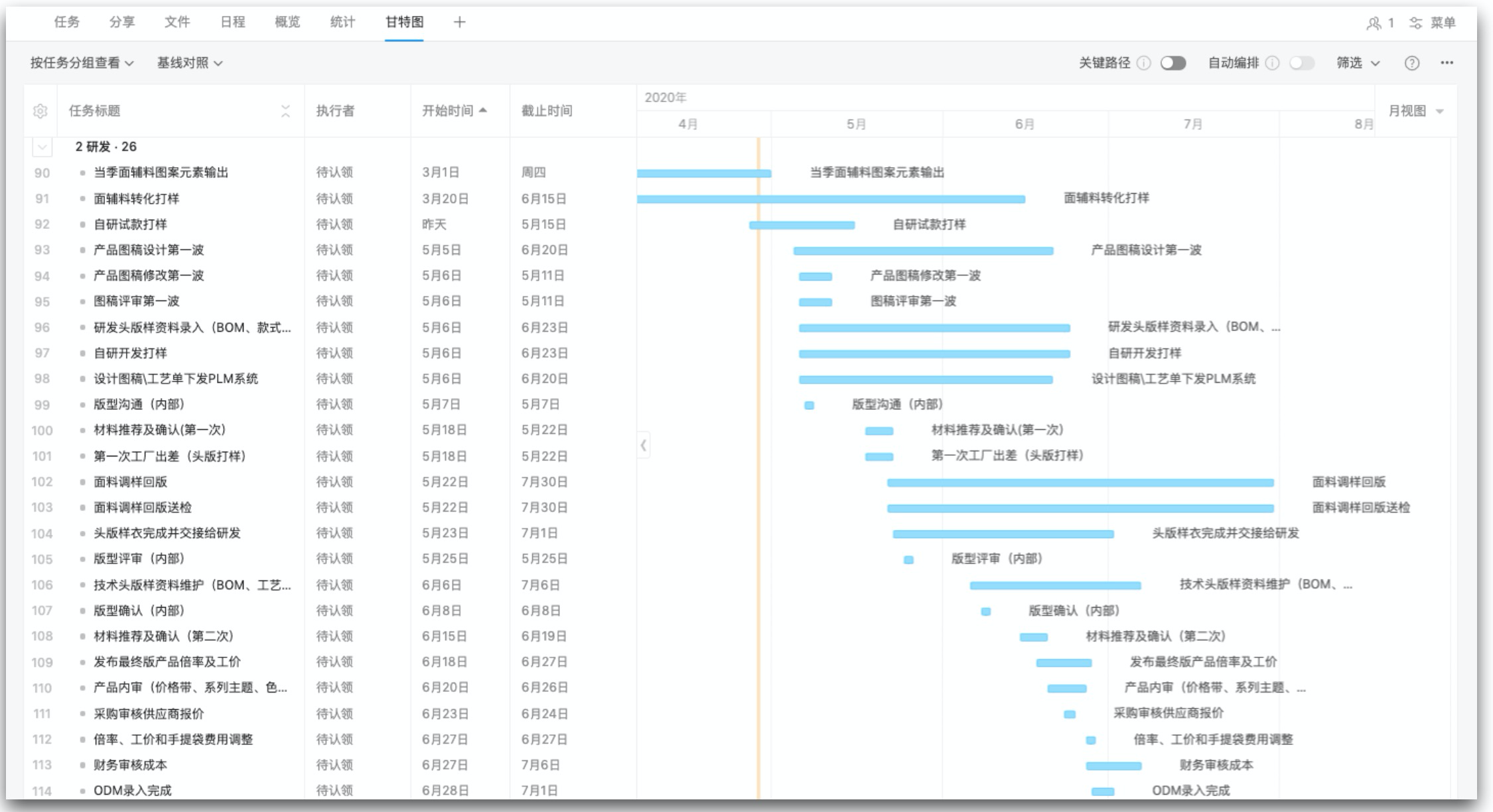 为了解决订货会协同中遇到的种种困难,柒牌集团通过将⿊标、中华⽴领红标等多标系产品季管理⾏事历承载在Teambition上,对单产品季19个重要节点和98个常规事项进⾏过程监控和⻛险管理,拉通了10多个中⼼部⻔的协作链条,并为产品季核⼼业务运作分析和监察提供了更加完整和透明的进度数据呈现。