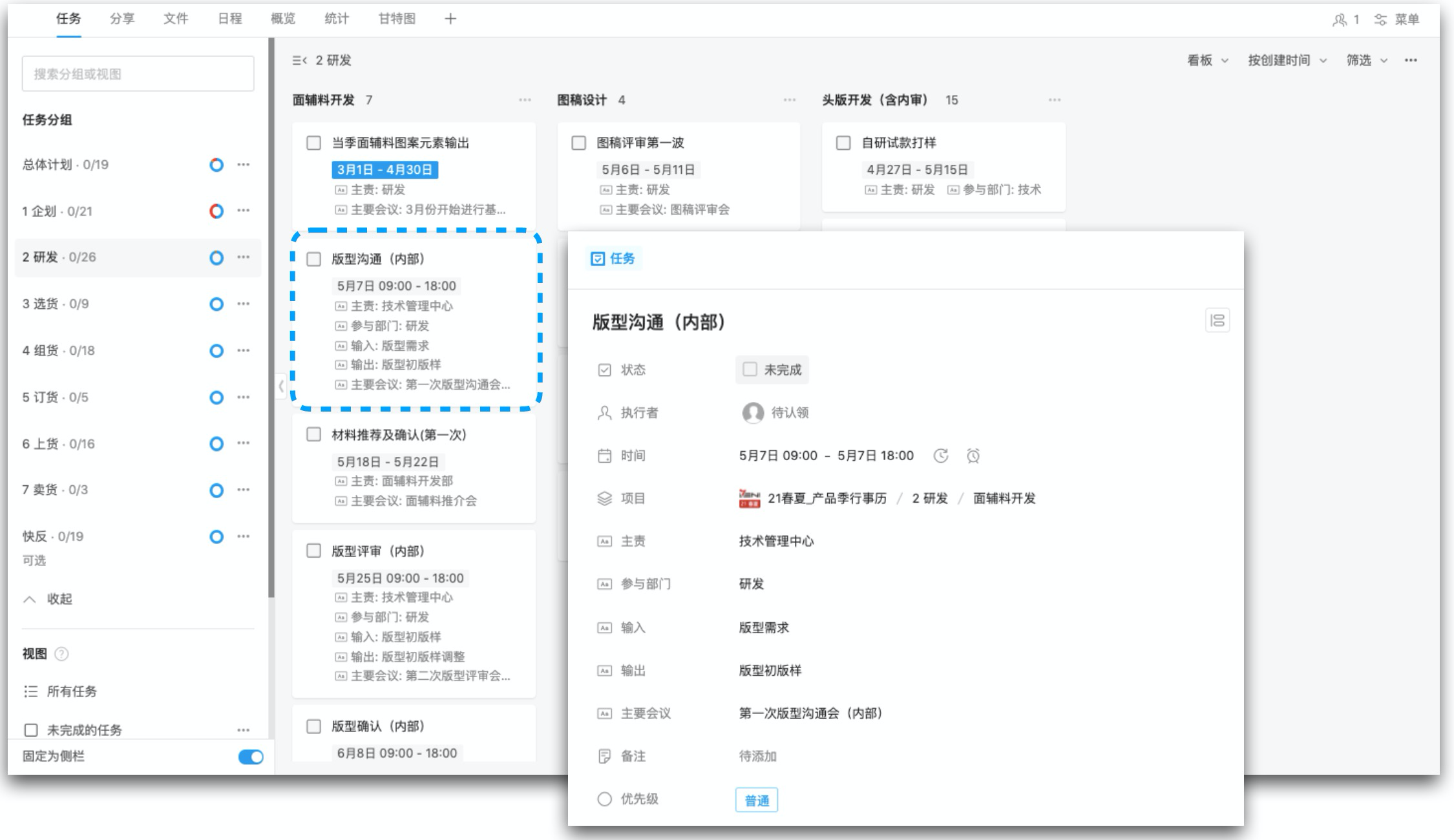在产品季项目的协同过程中,通过「任务分组」、「任务列表」、「任务进展」、「任务催办」等功能,将产品季的关键⾥程碑展示并同步出来,各环节能够随时记录和共享最新的进展、红绿灯状态和进度百分⽐,保证上下游协作⽅都能保持信息对⻬和节奏同步,有效降低逾期⻛险。