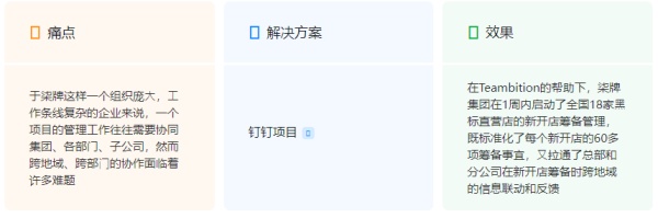 将Teambition应⽤到全国的⻔店管理中,是柒牌集团企业管理数字化转型的重要举措。在Teambition的帮助下,柒牌集团在1周内启动了全国18家⿊标直营店的新开店筹备管理,既标准化了每个新开店的60多项筹备事宜,⼜拉通了总部和分公司在新开店筹备时跨地域的信息联动和反馈。
