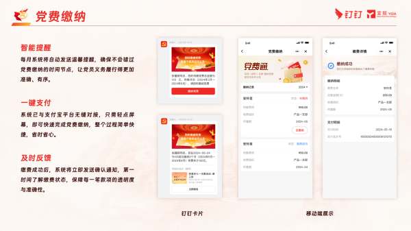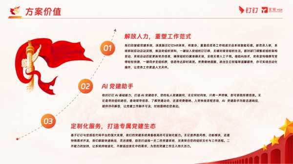 解放人力,重塑工作范式:智能党建系统,深度融合钉钉HR体系,将复杂、重复的党务工作彻底交由系统智能处理。新党员入职,系统即刻启动自动流程,推送党组织资料,一键加入党组织钉钉群,无缝对接党组织生活。面对部门调整或组织架构变动,系统自动匹配更新党员信息,确保组织归属准确无误,全程无需人工干预。借助AI技术,党务宣传稿撰写变得轻松快捷,一键同步至组织群,信息传达即时高效。党费缴纳提醒、政治生日祝福等温馨服务,亦可实现自动化操作,让党务工作更显人文关怀。