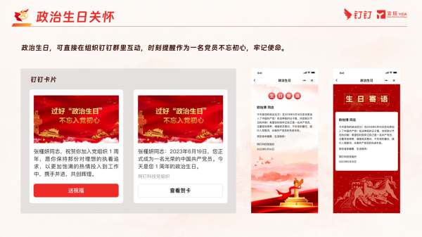 政治生日关怀:政治生日,可直接在组织钉群里互动,时刻提醒作为一名党员,要不忘初心,牢记使命。