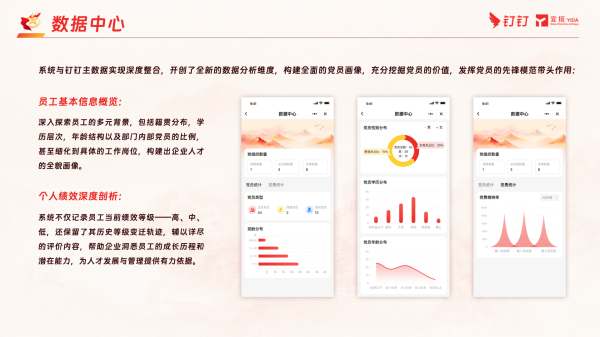 数据中心:钉钉党建系统已与钉钉主数据实现深度整合,开创了全新的数据分析维度,构建全面的党员画像,充分挖掘党员的价值,发挥党员的先锋模范带头作用: