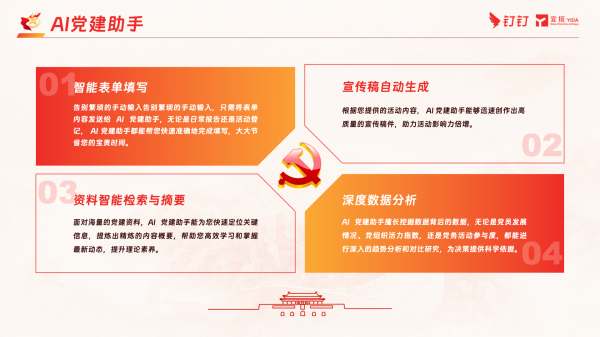 AI 党建,党建顾问时刻相伴:依托钉钉 AI 基础能力,打造 AI 党建助手,您的私人党建顾问,无论何时何地,只需一声呼唤,即可获取所需信息。无论是寻找组织路径、查询领导信息、了解党建动态,还是党费缴纳、入党转接流程咨询,AI 党建助手均能迅速响应,提供详尽解答,让党建工作触手可及,时刻围绕在您身边。