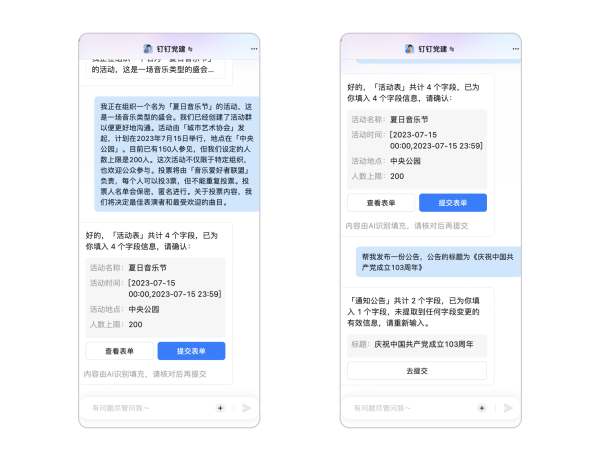 智能表单填写:告别繁琐的手动输入,只需将表单内容发送给 AI 党建助手,无论是日常报告还是活动登记, AI 党建助手都能帮您快速准确地完成填写,大大节省您的宝贵时间。