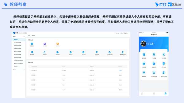 教师档案:教师档案整合了教师基本信息录入、奖项申报功能以及信息同步流程,教师可通过系统快速录入个人信息和奖项申报,审核通过后,系统会自动同步信息至个人档案,保障了申报信息的准确性和可信度,同时管理人员的工作流程也得到简化,提升了整体工作效率和质量。