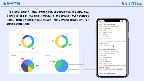 校长信箱:校长信箱系统为家长、教师、学生提供即时、便捷的反馈通道,校长收到反馈后,系统将识别反馈类型,为其推荐相应的处理部门,加快解决流程,并通过实时数据汇总分析,助力校领导及时发现当前问题的趋势。强化了家校之间的沟通和信任,使反馈和沟通更加实时高效。