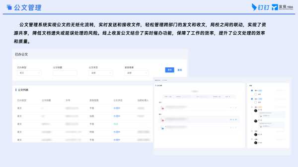 公文管理:公文管理系统实现公文的无纸化流转,实时发送和接收文件,轻松管理跨部门的发文和收文,局校之间的联动,实现了资源共享,降低文档遗失或延误处理的风险。线上收发公文结合了实时催办功能,保障了工作的效率,提升了公文处理的效率和质量。
