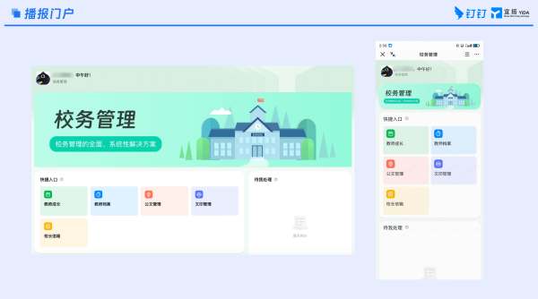 数字校园 - 校务管理解决方案基于钉钉 + 钉钉低代码打造。校务管理平台通过多功能集成和智能化设计,为学校提供全面的管理解决方案。汇集了教师档案管理、教师成长交流社区、校长信箱反馈系统、文印管理和公文管理系统等。实现了信息的实时同步、流程的自动化、以及跨部门的高效协作。
